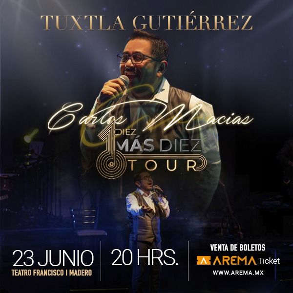 Después de una exitosa gira por Europa, regresa el Cantautor Chiapaneco Carlos Macías con su Tour 10+10, donde nos ofrece un concierto muy íntimo con un maravilloso recorrido por todos los éxitos que, como compositor ha ido sembrando durante 20 años.