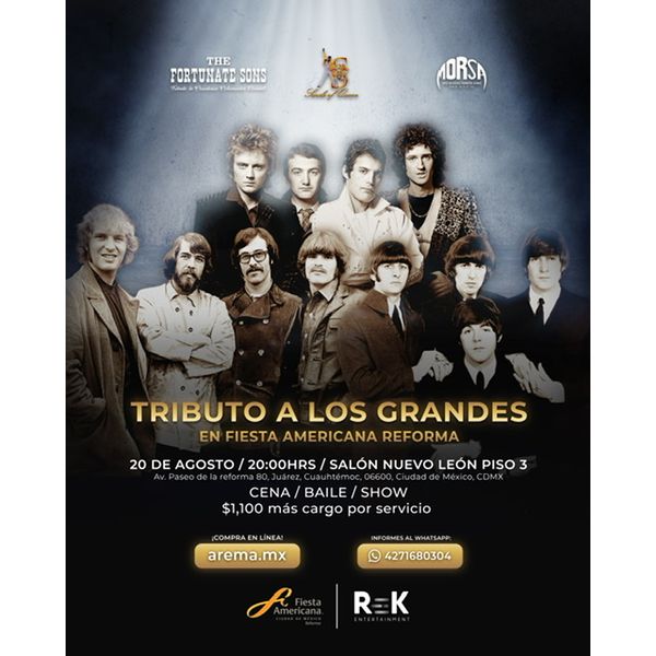 3 de los mejores Tributos de México “Beatles con el Grupo Morsa, Queen con el grupo Smile of Queen y Creedence con el grupo The Fortunate sons” Se presentarán en un mismo escenario para cantar y bailar por más de 3 horas seguidas en uno de los salones más emblemáticos de la Ciudad de México, Salón Nuevo León en el Fiesta Americana Reforma.