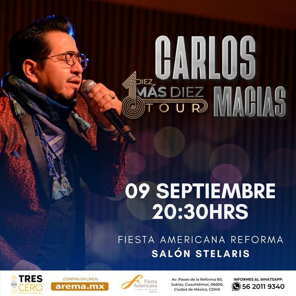 El compositor más exquisito de la última generación de compositores Carlos Macias, regresa este 09 de septiembre al Salón Stelaris del Fiesta Americana Reforma, presentando su Tour Diez más Diez.