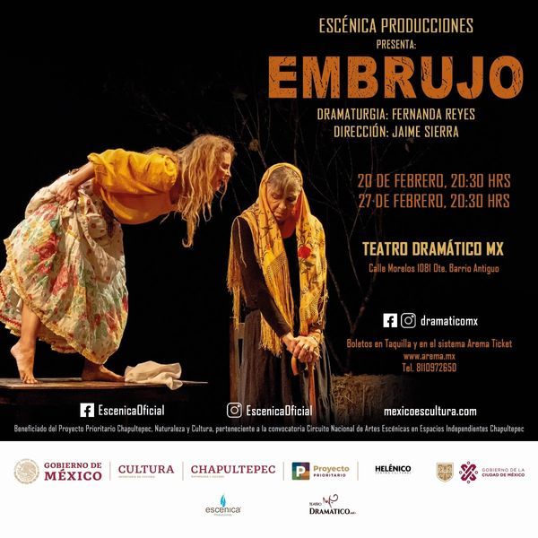 Espectáculo Multidisciplinario que incluye teatro, danza flamenca, danza contemporánea, cante flamenco y poesía. Embrujo nos habla de la historia de dos mujeres gitanas, madre e hija, y un hombre, que se enfrentan a las consecuencias de los usos y costumbres de su pueblo en los inicios de la guerra civil española. Obra original escrita por la poeta y pintora Fernanda Reyes, se inspiró en la historia de su madre de origen español , la argumentista, Maria Luis Algarra y de la experiencia teatral de su padre el muralista tamaulipeco José Reyes Meza.