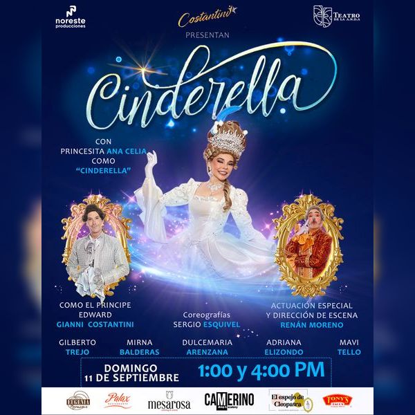 como cinderella la bella princesita anacelia, quién luchará por alcanzar la felicidad mientras su madrastra, interpretada por MIRNA BALDERAS mostrara sus verdaderas intenciones con tal de que cinderella no realice sus sueños a lado del príncipe Edward, interpretado GIANNI COSTANTINI (quien además de actuar produce este bello musical).