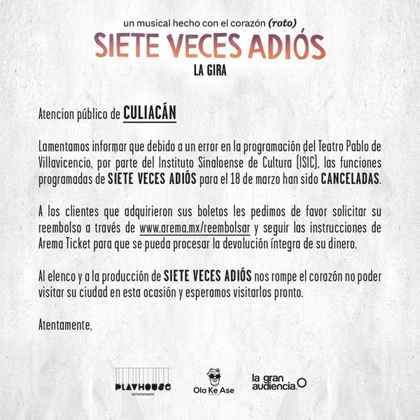 **Este evento fue cancelado por la empresa promotora del evento. El reembolso por el valor total de los boletos adquiridos puede ser solicitado en la plataforma arema.mx/reembolsos. Les recordamos que AREMA Ticket no realiza actividades de programación, promoción o cancelación de eventos, pero nuestros clientes pueden estar seguros que recuperarán su dinero, es parte del servicio que pagaron al comprar en nuestra plataforma. **