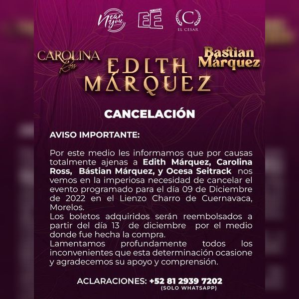 Evento fue cancelado por la empresa promotora del mismo. Les recordamos que AREMA Ticket no realiza actividades de programación, promoción o cancelación de eventos, Los reembolsos de boletos adquiridos pueden solicitarlos en arema.mx/reembolsos