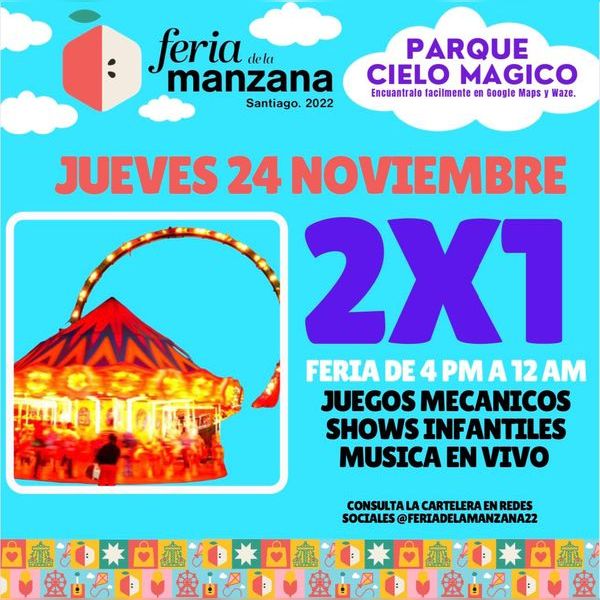 Ven y disfruta en familia de todos los juegos mecánicos las veces que desees, ademas de Shows Infantiles, Spots fotográficos, Food Trucks, Música en vivo, Juegos de destreza, Mercado emprendedor, Actividades didácticas, Área de picnic y muchas sorpresas más.. Síguenos en redes sociales para conocer la cartelera de cada dia de la semana y los horarios. @feriadelamanzana22
