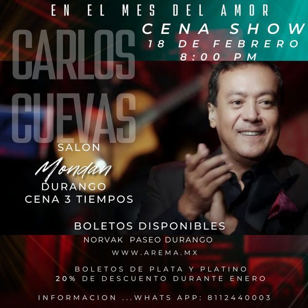 Carlos Cuevas en Cena Show! ¡No te quedes sin estar con el Rey del Bolero! INCLUYE Cena Romántica a 3 tiempos y barra libre de refresco ¿Ya vienes cenado? también tenemos espacios sin cena y con plato botanero al centro incluyendo la barra de refrescos (Zona Platino)