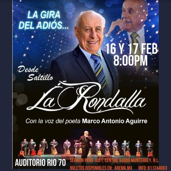 Desde Saltillo... La Rondalla con la voz del poeta Marco Antonio Aguirre El canto que enamora. Únicas funciones en la gira del adiós,después de 55 años de poesía el maestro Marco Antonio Aguirre deja su legado de amor!
