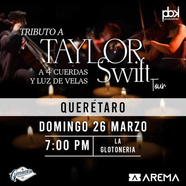 Evento único en el cuál por medio de la luz de las velas y el sonido vibrante de 4 cuerdas, Te llevarán a un viaje relajante, emocionante y fascinante por los mejores éxitos de la cantante Taylor Swift.