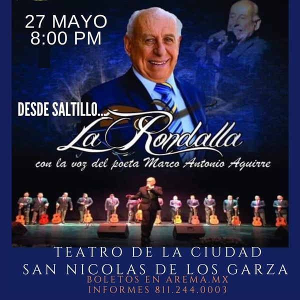 Desde Saltillo ...la Rondalla! Sigue el éxito y lleno total donde se presenta!..con todos sus éxitos que cautivan a los corazones..Wendoyn,Corazon de roca,historia de amor! con la voz del poeta Marco Antonio Aguirre. AL COMPRAR SE TE DARA UN CUPON DE DESCUENTO PARA EL EVENTO DEL CLUB DE LEONES. VIVE EL AMOR!!!!